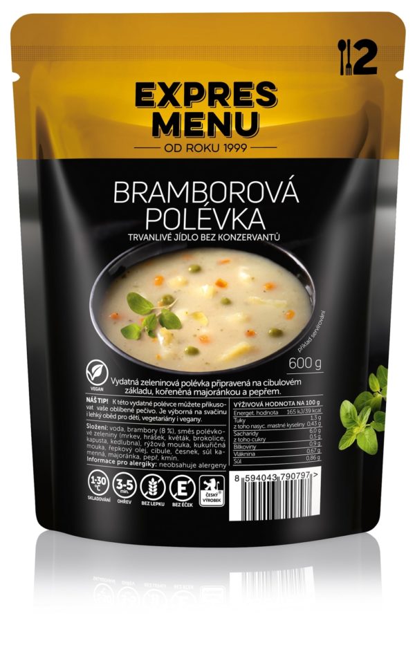 Složení: voda, brambory (8 %), směs polévkové zeleniny (mrkev, hrášek, květák, brokolice, kapusta, kedlubna), rýžová mouka, kukuřičná mouka, řepkový olej, cibule, česnek, sůl kamenná, majoránka, pepř, kmín.