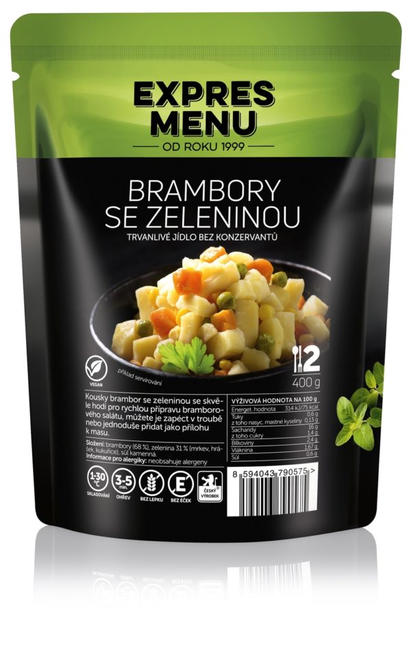 Složení: brambory (68%), zelenina 31% (mrkev, hrášek, kukuřice), sůl kamenná.