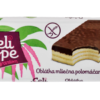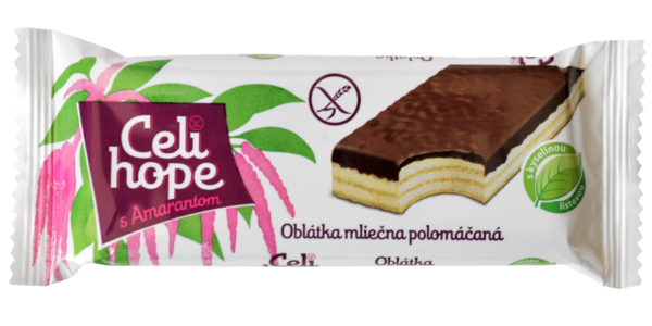 Oplatka s krémovou mléčnou náplní polomáčená kakaovou polevou.