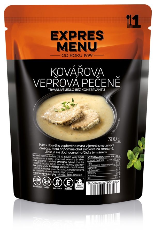 Složení: vepřové maso (33 %), hovězí vývar (voda, hovězí maso a kosti), kořenová zelenina (mrkev, celer, pastiňák, petržel), smetana, rýžová mouka, kukuřičná mouka, cibule, česnek, řepkový olej, hořčice (pitná voda, hořčičné semínko, ocet kvasný, cukr, sůl, kurkuma, extrakt koření), citrónová šťáva, sůl kamenná, divoké koření, pepř, tymián.