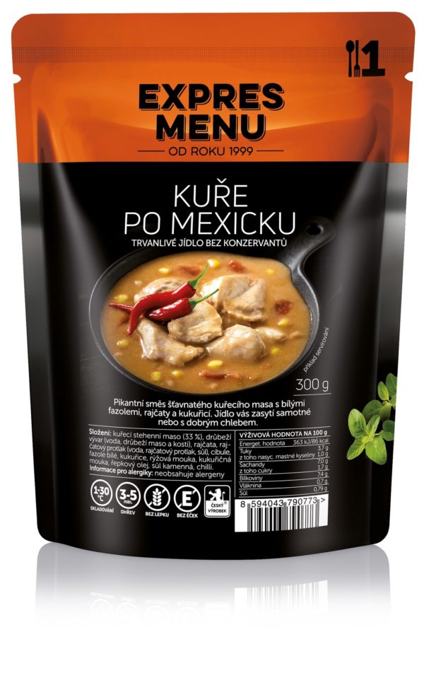 Složení: kuřecí stehenní maso (33 %), drůbeží vývar (voda, drůbeží maso a kosti), rajčata, rajčatový protlak (voda, rajčatový protlak, sůl), cibule, fazole bílé, kukuřice, rýžová mouka, kukuřičná mouka, řepkový olej, sůl kamenná, chilli.