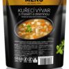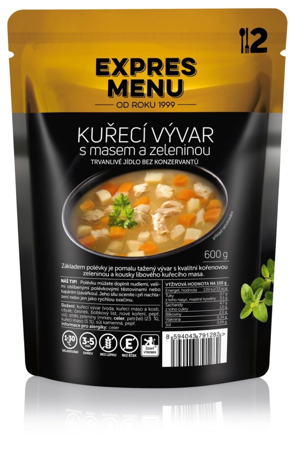 Složení: kuřecí vývar (voda, kuřecí maso a kosti, cibule, česnek, bobkový list, nové koření, pepř, sůl), směs zeleniny (mrkev, celer, petržel) (23 %), kuřecí maso (5 %), sůl kamenná, pepř.
