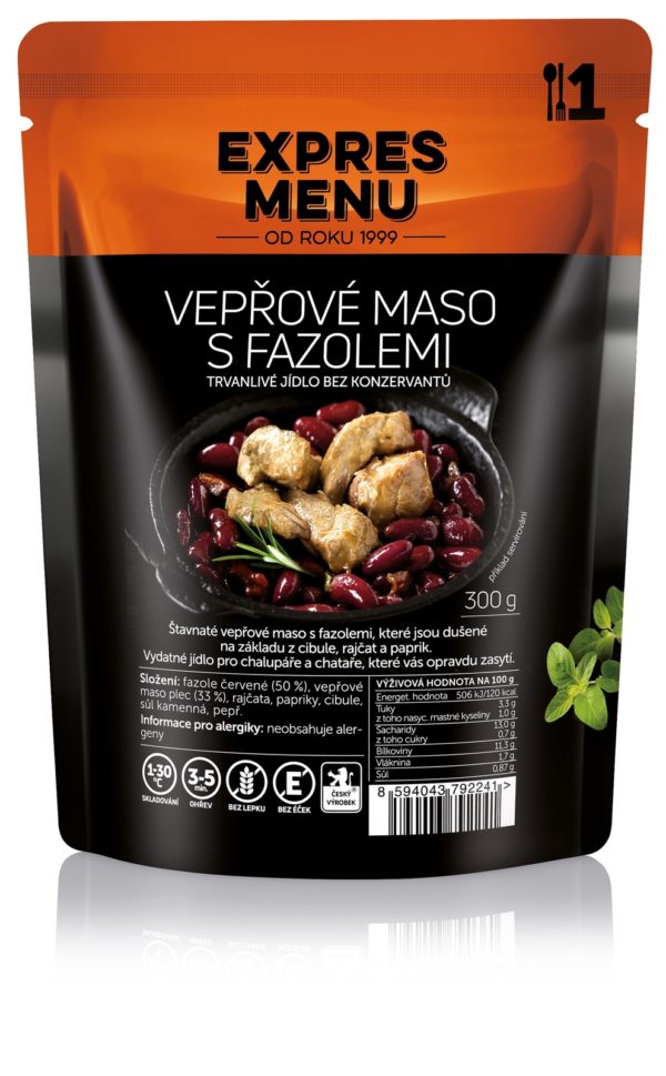 Složení: fazole černé (50 %), vepřové maso plec (25 %), lečo (rajčata, papriky, cibule) (23 %), sůl kamenná, pepř.