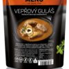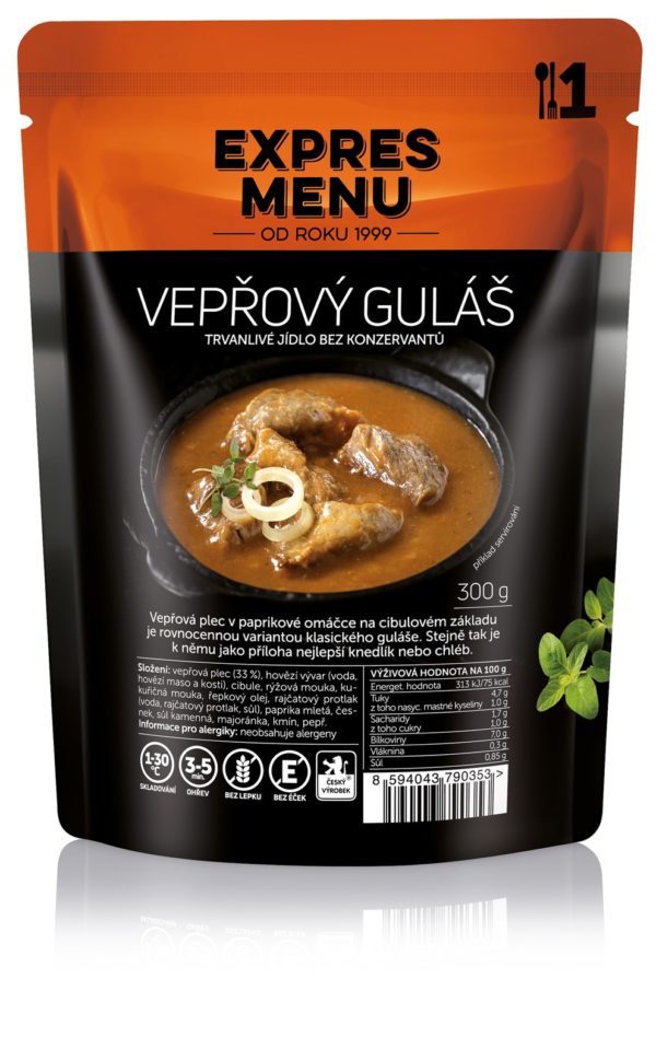 Složení: vepřová plec (33 %), hovězí vývar (voda, hovězí maso a kosti), cibule, rýžová mouka, kukuřičná mouka, řepkový olej, rajčatový protlak (voda, rajčatový protlak, sůl), paprika mletá, česnek, sůl kamenná, majoránka, kmín, pepř.